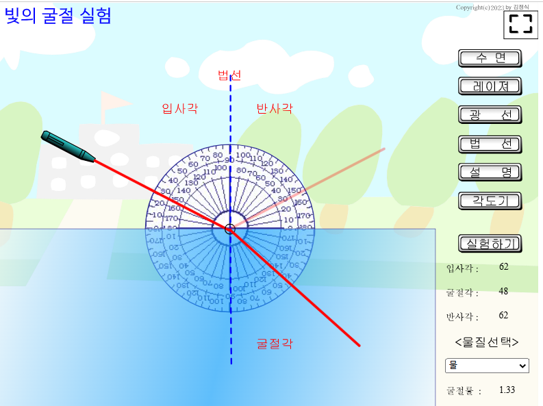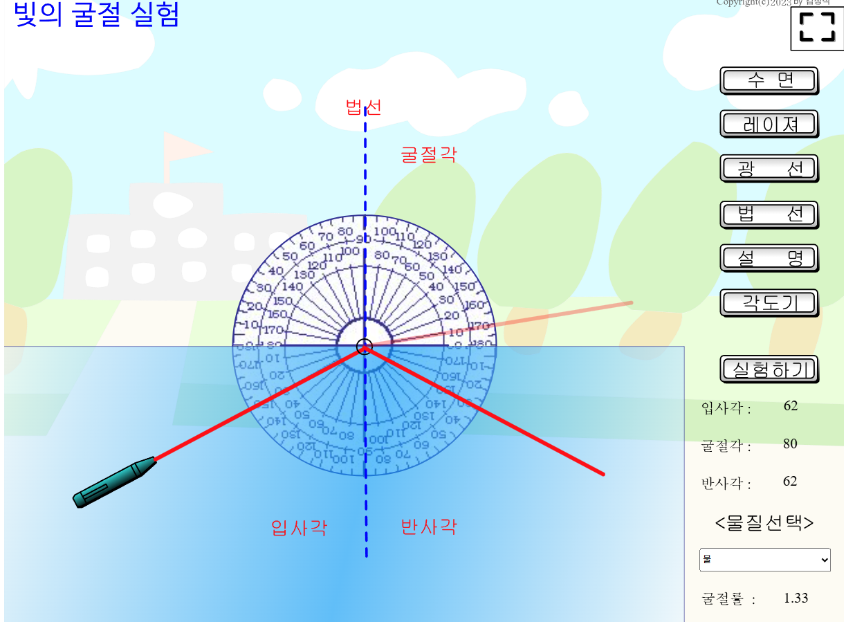 빛의 굴절실험을 가상으로 할 수 있도록 만들었습니다.