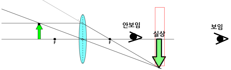즉 실상이 만들어지면 그게 렌즈에 의해 만들어 진 상인지, 아니면 실제 그 위치에 실제 물체가 있는 건지 구분할 수 없다. 따라서 만들어진 실상을 보려면 눈의 위치는 실상보다 뒤쪽에 있어야 한다.