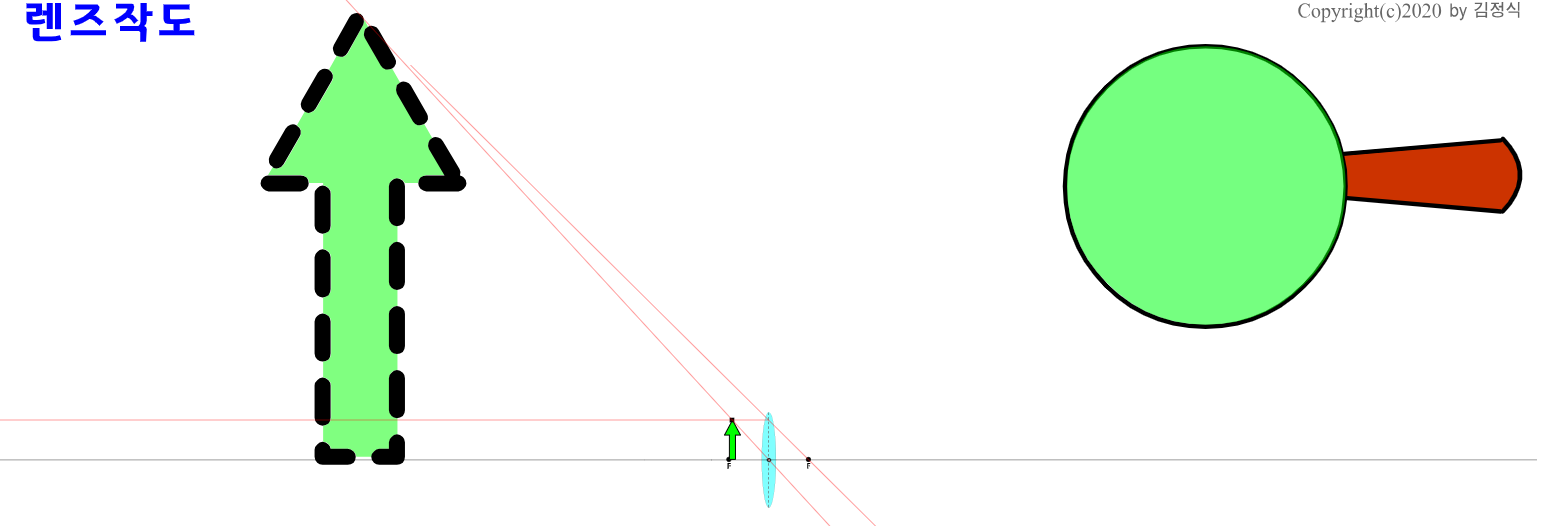<추가> 물체가 초점거리에 가까이 있을 때 상을 작도해 보면 거의 무한대로 커진다. 그런데 왜 우리가 돋보기로 볼 수 있는 물체의 크기는 무한대로 커진 물체를 못 보는 걸까?