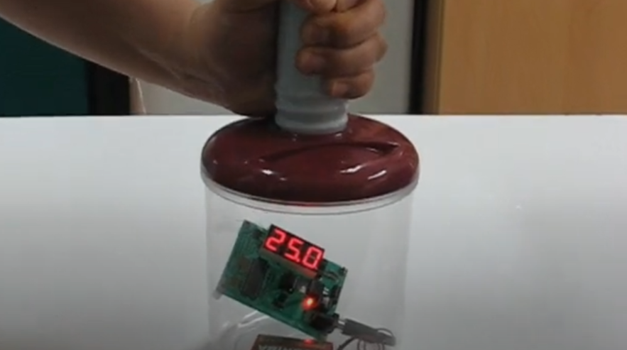 진공용기안에 공기를 빼서 단열팽창을 시켜가며 온도변화를 살펴보았다.