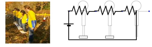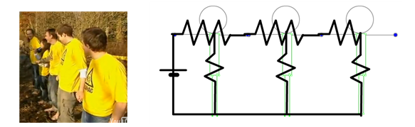 마. 단순한 병렬연결과의 차이점은 사람끼리 잡고 있는 손에 있습니다. 일반적으로 병렬연결의 경우에는 저항과 저항을 연결할 때 저항이 거의 없는 선으로 연결하지만 이 화면에서는 사람끼리 손을 잡고 있기 때문에 사람이라는 저항과 저항 사이에 전선의 역할을 하는 팔 자체도 저항으로 작동하게 됩니다.