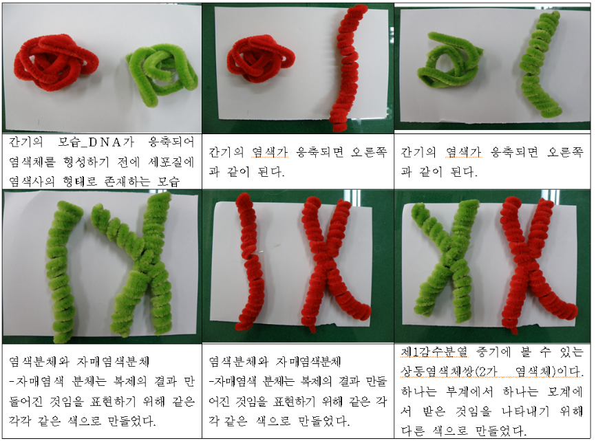 1. 염색사, 염색체, 상동염색체, 2가 염색체의 개념을 설명한 후, 모루끈으로 각각의 모형을 만들어 보도록 한다. 상동염색체와 2가 염색체에 대해서는 학생들이 어려워하고 오개념도 많이 가지고 있다. 어떻게 만들어야 할지 토의해 보도록 한다.