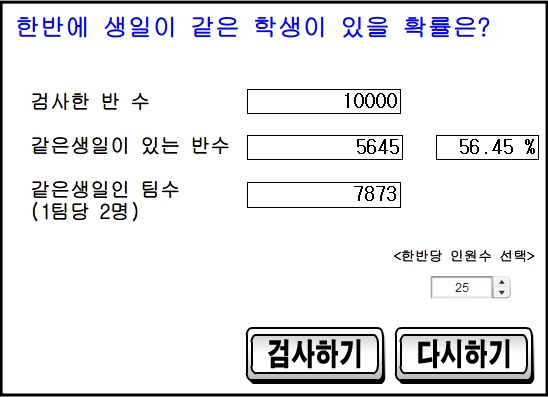한반이 40명이라 가정할때 컴퓨터 시뮬레이션 결과 1000반을 검사해 보면 생일이 같은 팀이 2000팀(4000명)정도 나옵니다.