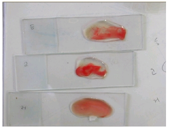 적혈구를 이용한 삼투압 실험 - 고장액을 넣게 되면 삼투압에 의하여 적혈구의 혈장성분이 세포막을 빠져나와 적혈구가 수축을 하게 됩니다. 따라서 혈액이 퍼지기는 커녕 더 응집된 것처럼 보이지요. 저장액을 넣게 되면 삼투압에 의한 위와는 반대작용으로 적혈구안으로 세포막을 통하여 저장액의 용매가 공급되어 점점 팽창하다가 나중엔 터져버리기까지 합니다. 따라서 희미하게 넓게 퍼져 보이는 거지요. 등장액에선 삼투압의 차이가 없으니 그냥 단순 분산현상에 의한 퍼짐입니다.