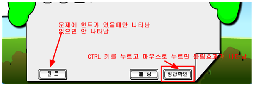 (마우스가 틀림버튼으로 가면 학생들이 벌써 틀렸다는 것을 눈치챌 수 있으므로 똑같이 정답확인 버튼을 누르면서도 CTRL 키를 누른상태에서 누르면 틀렸다는 표시가 나온다.)