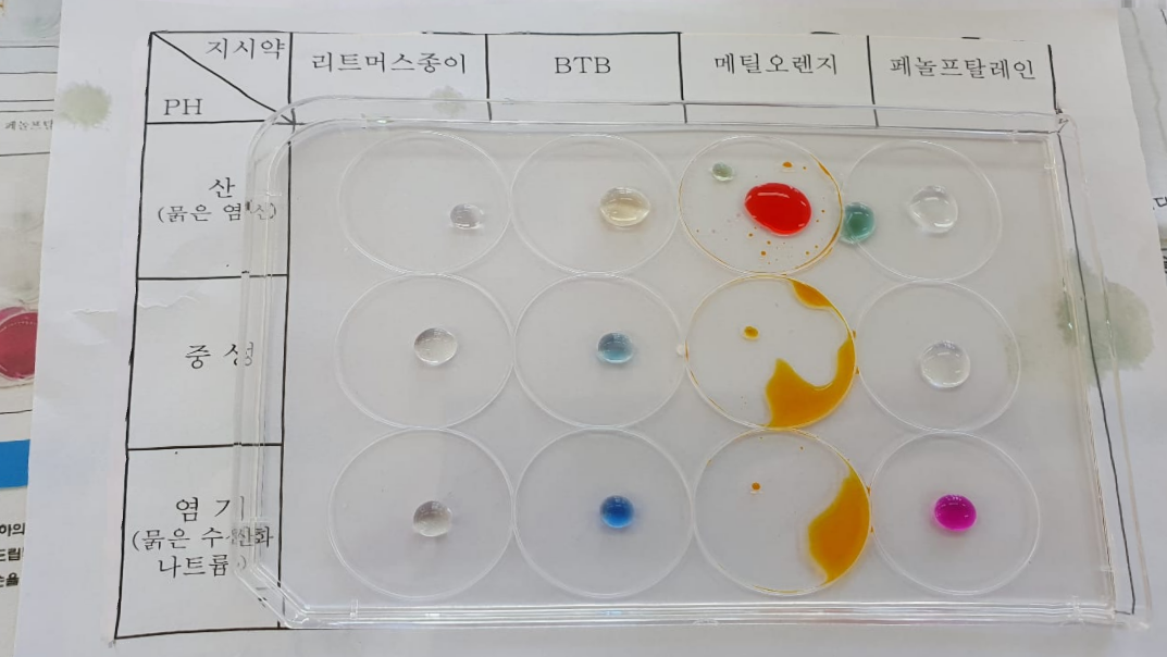 3. 초록색 스티커가 붙어있는 수용액을 떨어뜨리면서 반응이 일어나는지 확인하게 하였다.