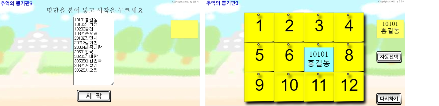 맨아래 임시로 이름을 넣을 수 있는 추억의 뽑기판 3.0도 만들어 두었다.