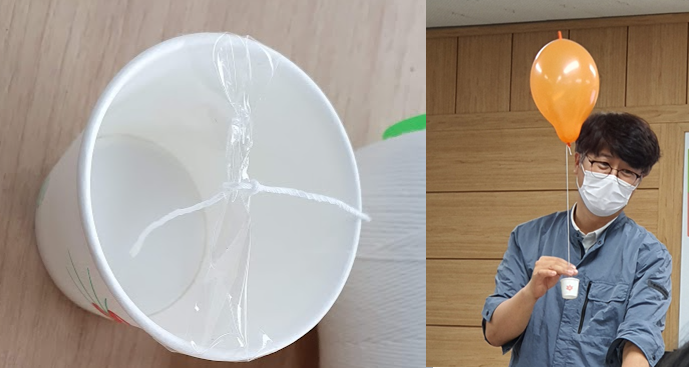 종이컵에 물양을 조절해서 천장까지 풍선이 떠오르는 시간 맞추기 게임