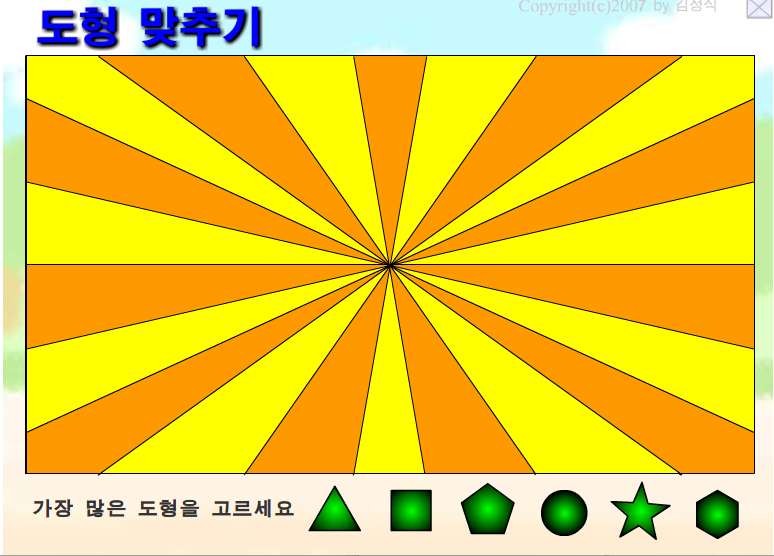 개발자료(학급,수업운영)/학급게임자료 도형 맞추기(KBS 두뇌왕 아인슈타인 문제) by 민서아빠(과학사랑) 2008. 8. 21. 도형맞추기.zip 0.85MB <사용법>KBS 두뇌왕 아인슈타인에 나왔던 문제를 보고 만들어 보았습니다.움직이는 도형중에 가장 많은 도형을 찾는 간단한 게임입니다.단계가 높을수록 나타나는 도형수가 많아져서 어려워 집니다.같은 단계라도 할때마다 도형의 수가 달라지므로 얼마든지 반복해서 할 수 있습니다. 공유하기 게시글 관리 김정식 허명성의 과학사랑 관련글 가나다 모형 연결하기(스펀지 공부잘하는법 시각주의력 향상게임) 가족오락관(돌아라말판아)1.0 우주선 조절게임 - 소리이용 박수소리로 움직이는 경주게임2 - 마이크사용