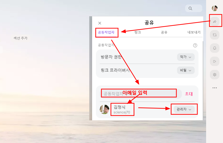 나. 공동작업자 추가 - 공유를 누르고 공동작업자에 이메일주소를 입력하면 공동 작업을 할 수 있다. 이때 공동작업자는 관리자로 설정해 주자.