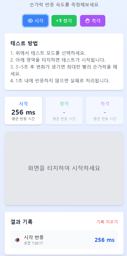 1. 촉각 테스트 기능을 추가 했다. 스마트폰 진동이 울리는 순간 화면을 누르면 된다.(일부 기기는 지원하지 않는다)