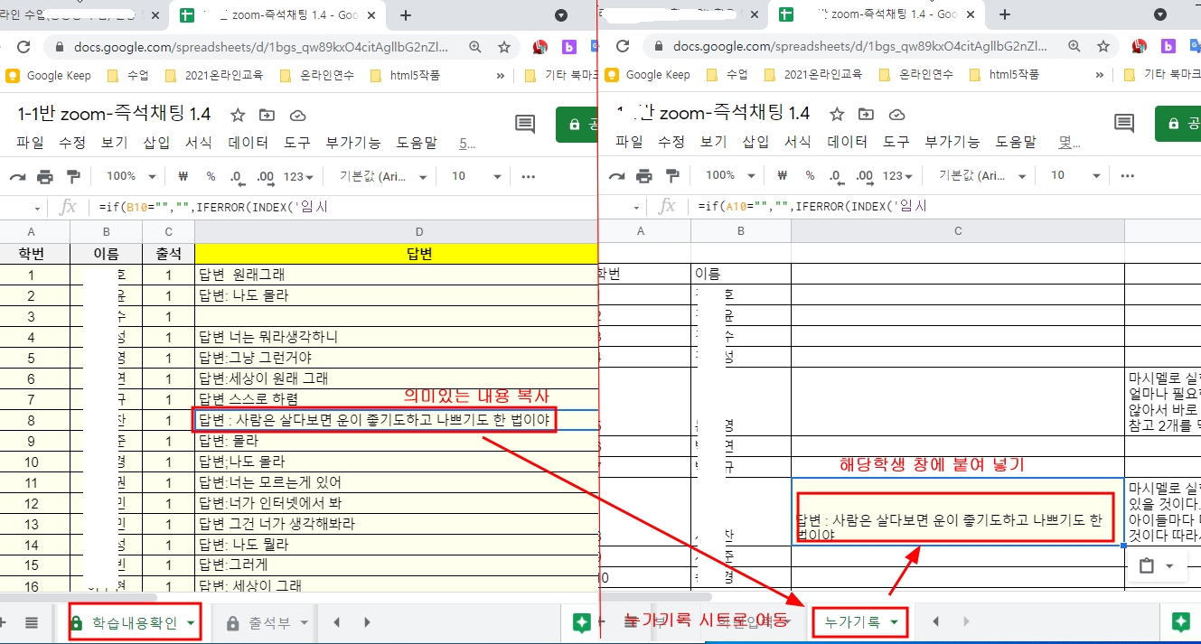 다른 기록장 준비하지 않아도 되고, 무엇보다도 빠르게 즉석에서 기록내용을 복사해서 붙일 수 있기 때문에 좋다. 최근에 이런 방법으로 온라인 수업에서 학생들 자료를 누가기록해 주고 있다. 사용해 보니 간편하고 좋아서, 아예 시트를 추가해 놓았다. 발표를 열심히 하거나 할때도 추가로 간단하게 기록해 주면 된다.