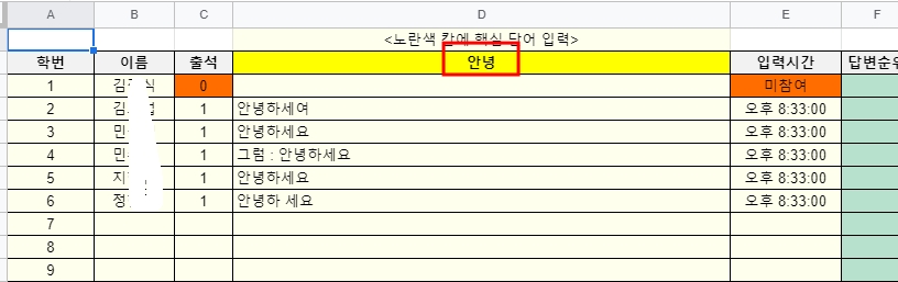 이 방법은 학생입장에서 그냥 자신의 학번과 이름을 입력하고 들어오기만 하면 되기 때문에 별다른 추가작업이 필요 없고. 선생님만 학번입력 시트에서 학생 이름앞에 번호를 붙여 주는 걸로 모든게 해결 된다. 2학생만 번호를 붙이는게 꺼려진다면 모든 학생 이름앞에 번호를 붙여도 된다.