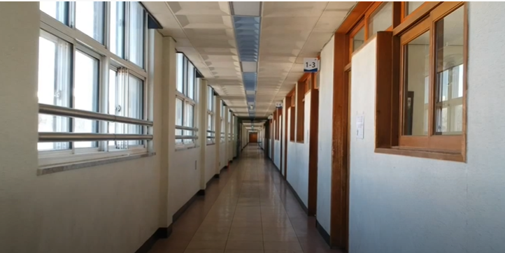 복도식으로 되어 있는 1학년 교실 끝에 특별실이 있는데, 특별실에서 수업을 듣는 3학년 학생들이 수업시간에 화장실 가겠다고 나와서 돌아다니는 것으로 보였다.