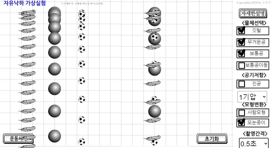 가상실험을 통해 우측 공기저항 옵션에서 진공으로 바꿔 놓고 실험해 보면, 똑같이 떨어지는 걸 알 수 있다