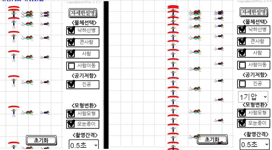 그래서 가상실험에 사람 모형을 추가해 놓았다. 이것도 공기저항을 바꿔 가면서 실험해 보면 알 수 있다.