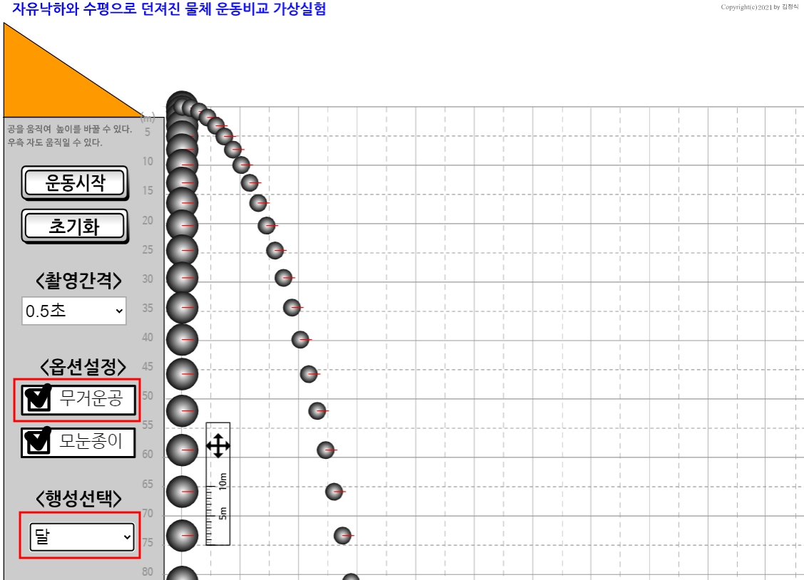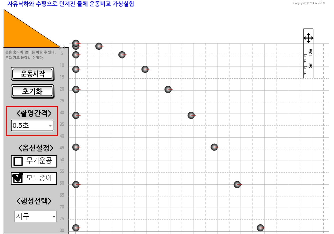 - 실제 상황과 거의 똑같이 만들어져 있다. 학생들이 우측에 있는 자를 이용해서 정확하게 낙하한 거리를 측정해서 보고서를 작성하게 할 수 있다.