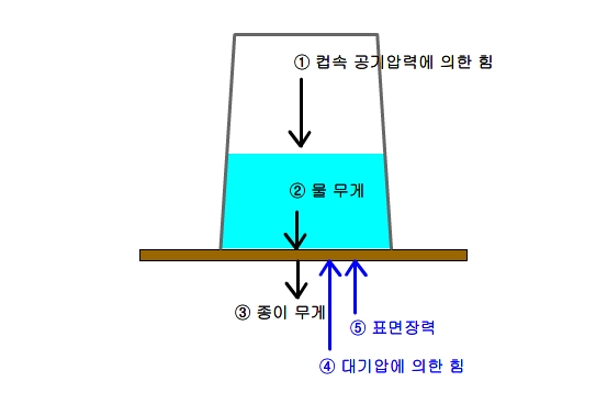 ④ 대기압에 의한 힘 + ⑤ 표면장력 > ①컵속 공기압력에 의한 힘 + ②물의 무게 + ③종이의 무게 가 되야 한다.