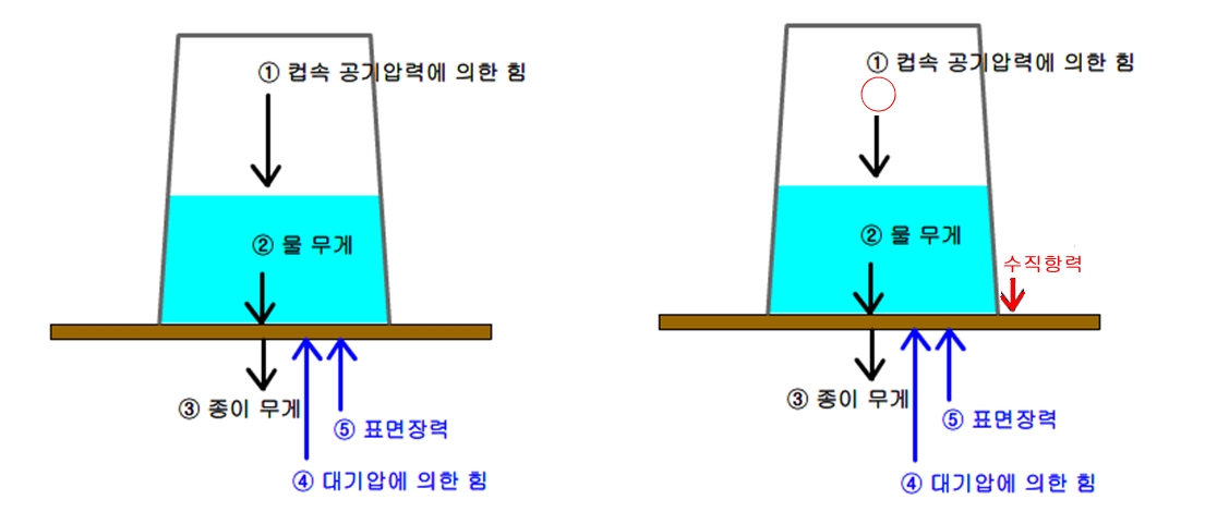 기압차이(④ 대기압에 의한 힘 - ①컵속 공기압력에 의한 힘) = ②물의 무게 + ③종이의 무게 + (수직항력) - ⑤ 표면장력 이 된다. 이때 수직항력은 0 이 되고, 표면장력과 종이의 무게는 변하지 않는다고 가정하면