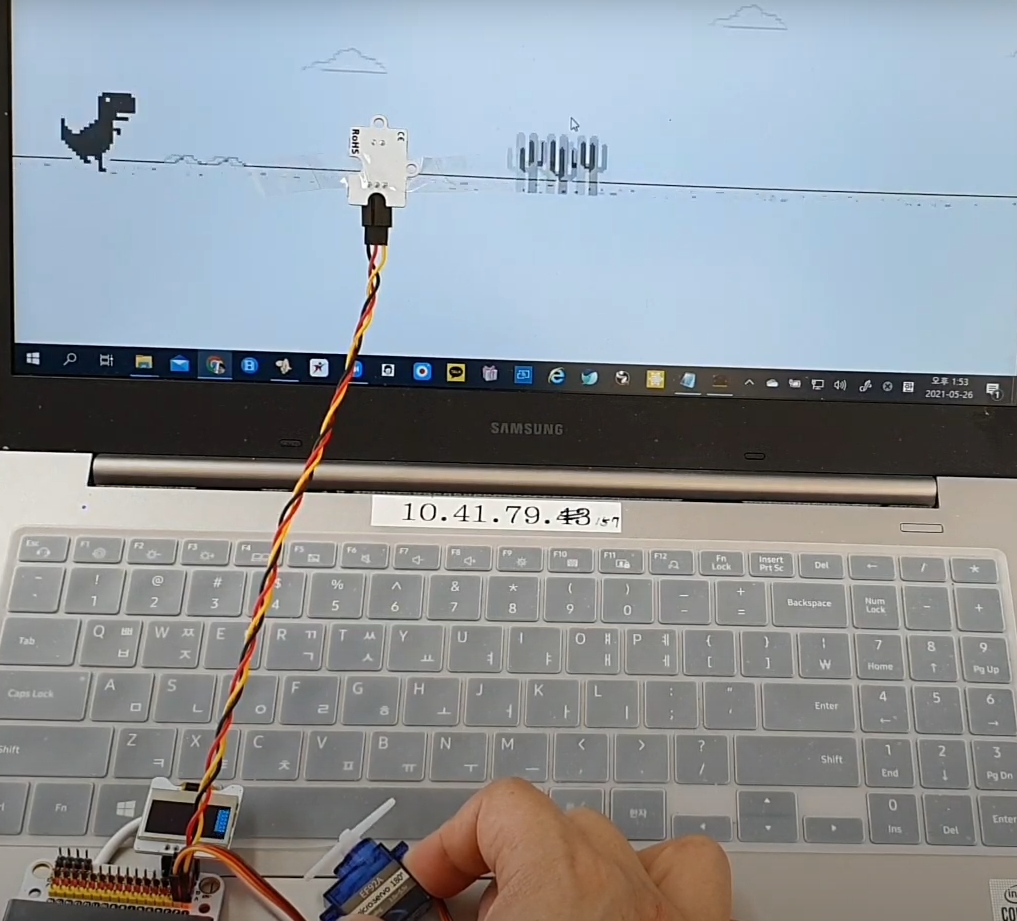 광센서 위치를 모니터 화면에 잘 맞춰주면 프로그램 짜 논 대로 스스로 스페이스바를 눌러 가며 게임을 한다.