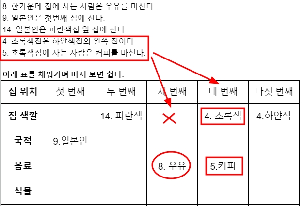 4번과 5번을 한꺼번에 비교해 보면 채워 넣을 수 있는 곳이 1곳만 나온다. 초록색 집이 세번째 위치에도 올 수 있지만 그렇게 되면 5번 조건에서 커피를 마신다고 했는데 이미 우유가 자리잡고 있기 때문에 3번째 위치에 초록색 집이 올 수 없고 네번째 위치에만 올 수 있다. 그럼 5번째 위치는 하얀색 집