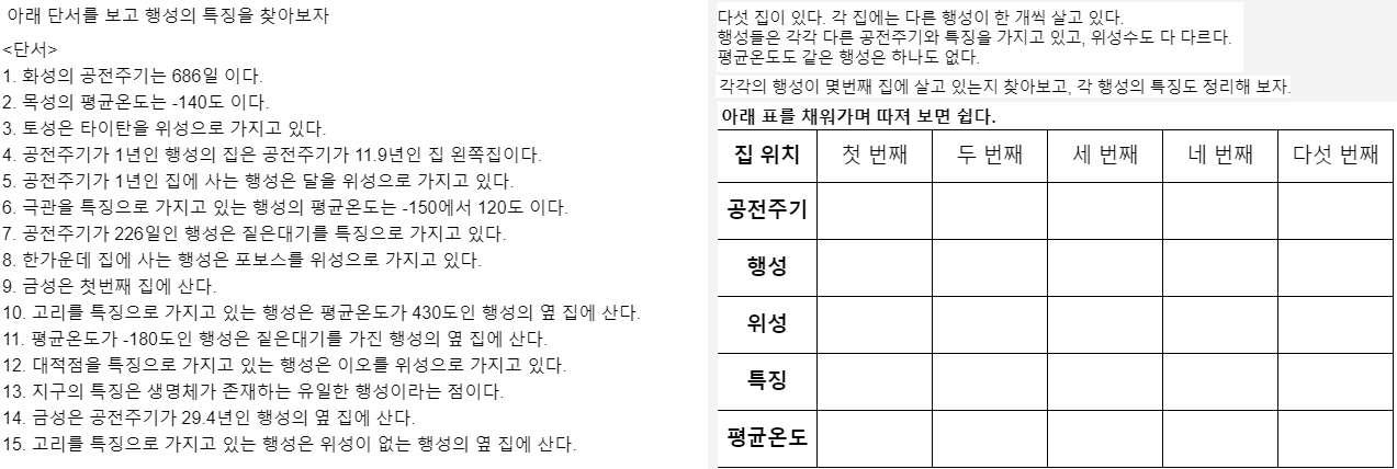 <추가> 수업내용으로 바꿔서 사용해도 좋다. 암석의 종류와 특징, 태양계 행성의 종류와 특징 등, 식물계 특징 등...