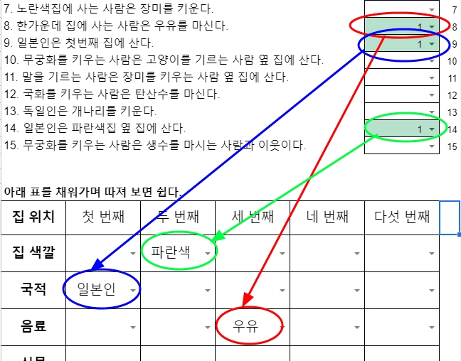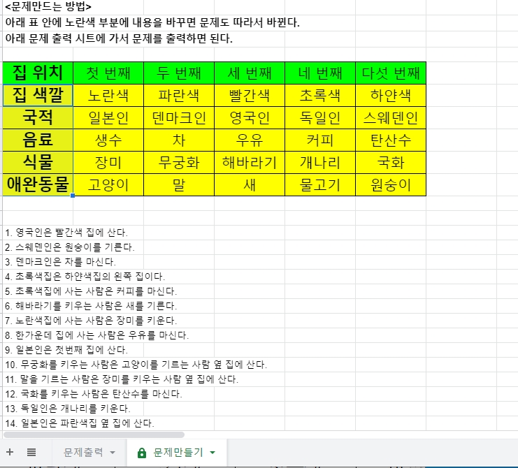 만약 복사해서 직접 만들어 보고 싶다면 아래 사본만들기를 눌러 아인슈타인 퍼즐 만들기 구글스프레드시트를 복사해가서 사용하면 된다.