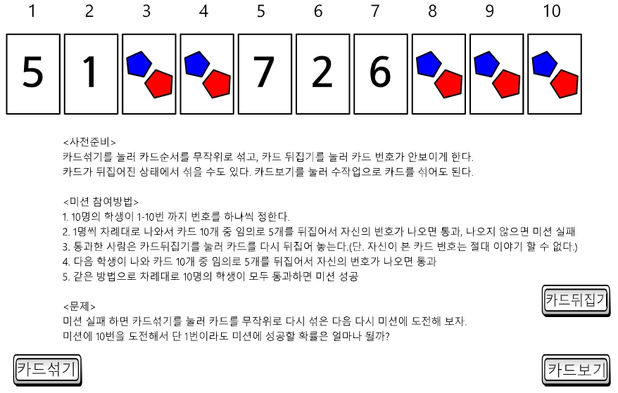 아래 링크에 프로그램을 만들어 놓았다. 카드를 섞고 뒤집어서 규칙에 맞게 도전해 보자. 3번 중에 1번은 10명 모두 통과해서 미션을 성공할 수 있을 것이다.