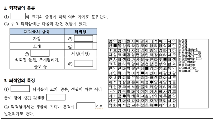 결정이큰화강암, 흐린저기압, 자갈모인역암 등등 간단하게 단어에 학습내용을 포함해서 찾을 단어로 제시하면 좋다.