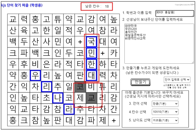 학생들은 단어입력에 선생님이 불러준 단어를 입력하거나, 보내준 단어를 붙여넣기 한 후 만들기를 눌러 단어찾기 퍼즐에 참여하면 된다. 각 칸을 눌러 단어를 맞추면 된다.