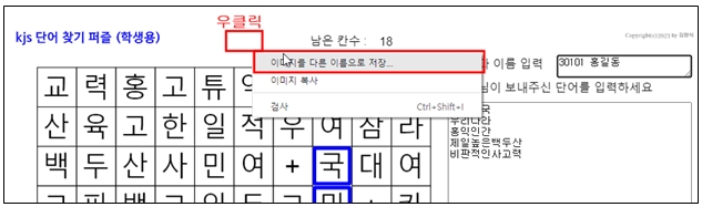 제대로 풀었는지 확인하고 싶다면 화면을 저장해서 그림파일을 보내게 하면 된다. 크롬에서는 화면위에서 마우스 오른쪽을 눌러 이미지를 다른이름으로 저장을 누르면 바로 그림파일로 저장할 수 있다. 스마트폰의 경우에는 화면을 캡처해서 보내면 된다.