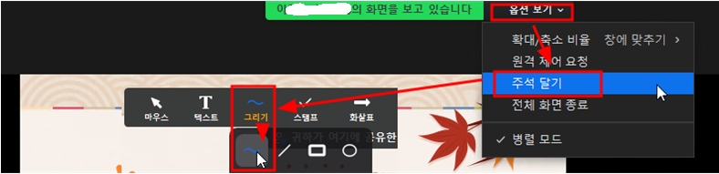 화면을 공유하면 선생님의 화면을 보고 있습니다. 옆에 옵션보기를 누르면 주석달기를 할 수 있다.