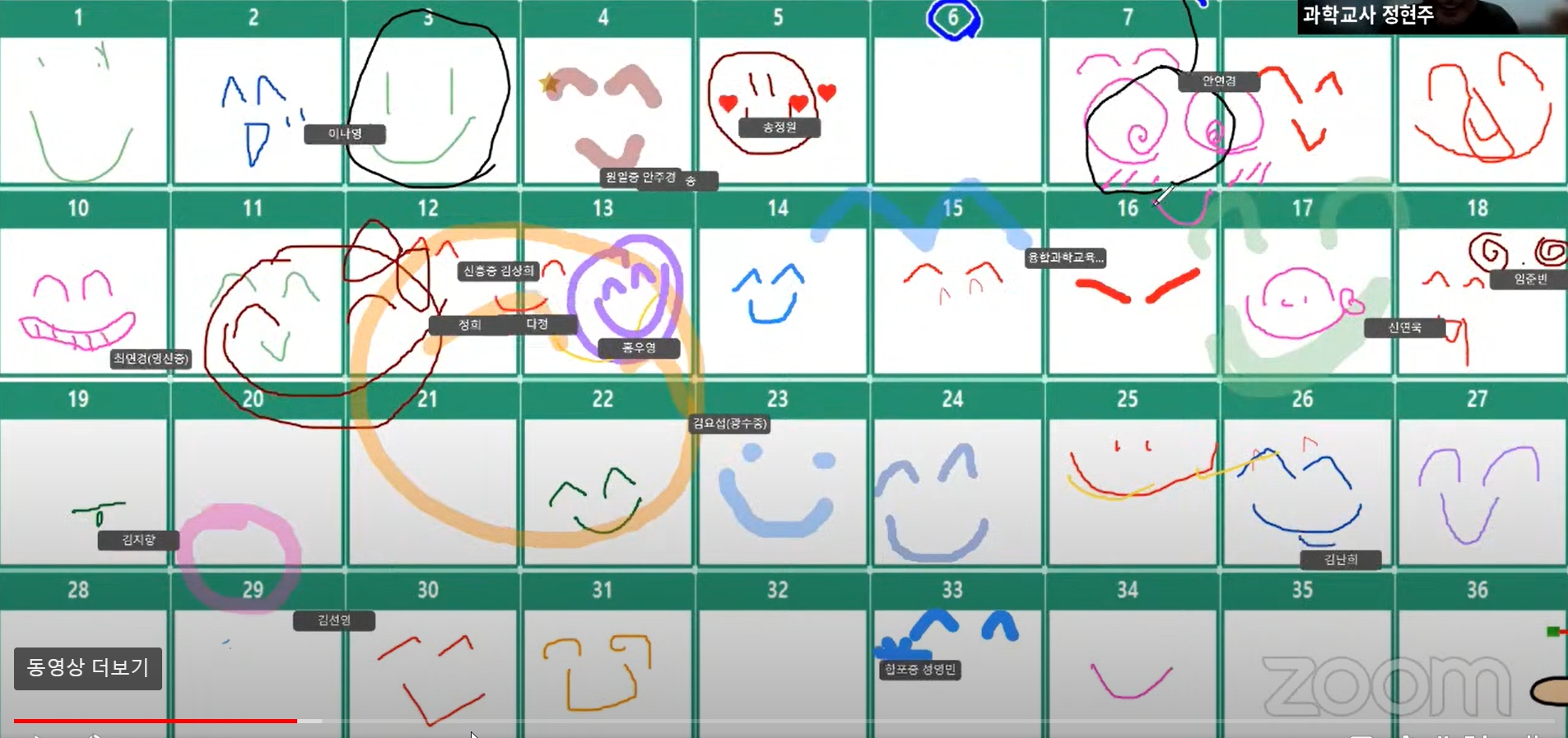가장 간단한 것 부터 시작해 보자. 화면 공유하 고자신의 기분을 자신의 번호밑에 얼굴모양으로 그려보게 해 보자.