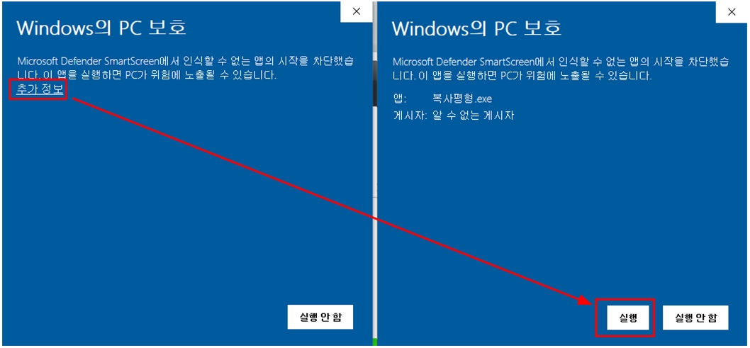 윈도우10에서 보완이 강화되어 인터넷에서 다운 받은 실행화일의 경우 안전성 확인을 위해 경고메시지가 뜬다. 프로그램 실행시 아래 그림처럼 경고창이 뜨면 추가정보를 눌러 – 실행을 시키면 된다. 한번만 실행시키면 그 다음 부터는 물어 보지 않는다.