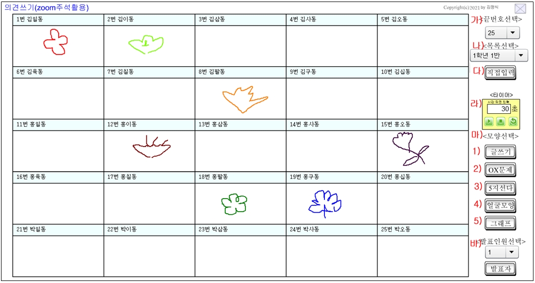 미리 만들어 두지 못했을 때 바로 사용할 수 있도록 학생들 이름이 바둑판 형태로 나타나는 프로그램을 만들어 보았다. 만드는 김에 발표자 뽑기와 생각나는 여러 가지 기능을 추가해 보았다.