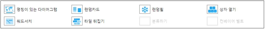 빨간원이 표시되지 않은 워드서치를 비롯와 다른 템플릿들은 이미 만든 활동에서 템플릿 변환하기를 통해 바로 변환 할 수 있다. 예를 들어 액티비티 생성하기에서 ‘명칭이 있는 다이어그램’을 만들면(반드시 이미지 포함) 나중에 녹색칸으로 표시한 랜덤카드, 랜덤휠, 상자 열기, 워드서치, 타일뒤집기 등으로 바로 변환해서 과제를 낼 수 있다. 아래 그림에 있는 것들로 변환이 가능하다.