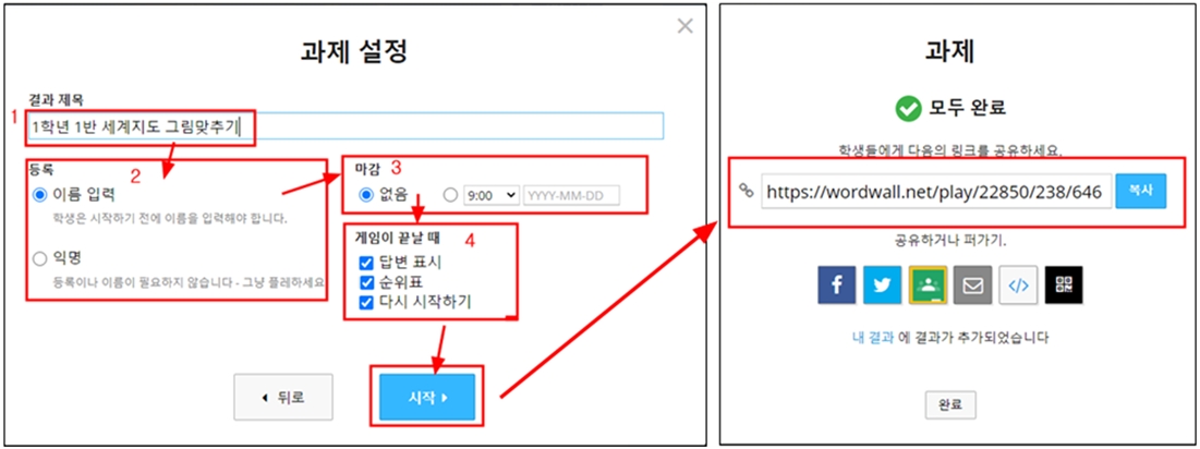 설정이 끝나면 시작을 눌러 나오는 링크 주소를 복사해서 학생들에게 제공해 주면 된다.
