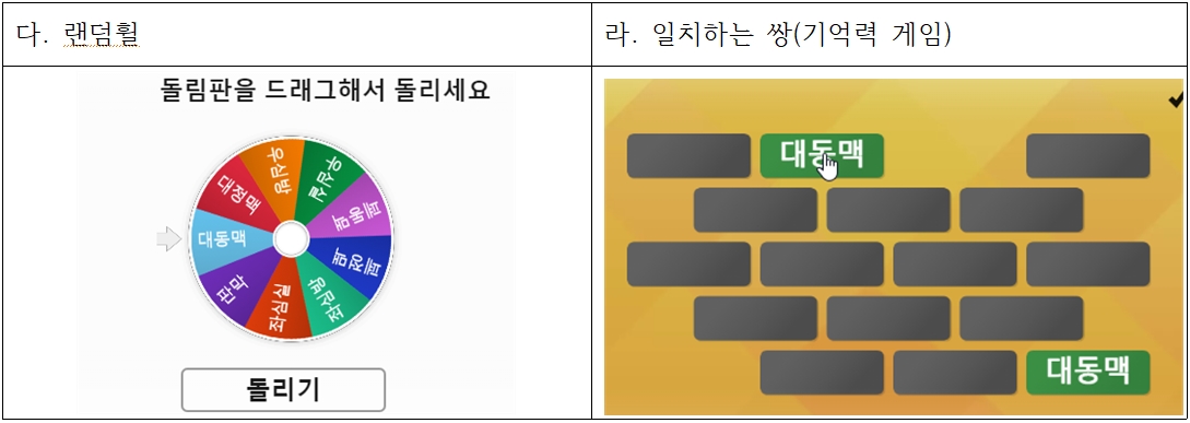 라. 일치하는 쌍(기억력 게임) - 카드를 2장씩 뒤집어서 같은 내용의 카드를 찾아내는 전형적인 게임이다. 어느 위치에 같은 글자가 있는지 기억해야만 한다. 재미있게 게임처럼 접근하면서 용어를 공부하게 할 수 있다.