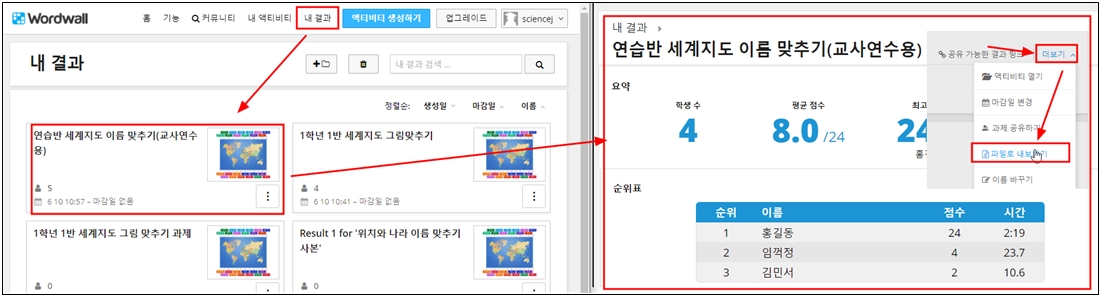 선생님은 내결과에 가서 과제로 낸 제목 중에 원하는 과제를 선택하면 과제 결과를 확인할 수 있다. 결과에는 과제제출 여부 부터 다양한 내용들(평균점수, 참여학생수, 점수분포, 정오답률, 순위표, 문항별 분석)을 확인할 수 있고, 필요하면 더보기-파일로 내보내기를 눌러 엑셀로 저장할 수 있다.