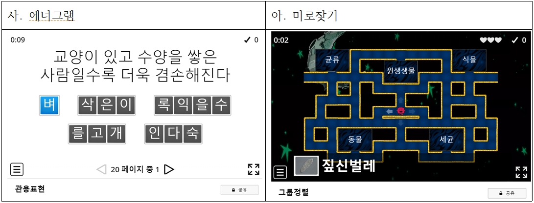 사. 에너그램 – 문장배열하기와 같은 형식이다. 문장배열하기가 단어들을 이동시켜 올바른 문장을 만드는 활동이라면, 에너그램은 한글자씩 이동시켜 문장에 있는 단어들을 완성시키는 활동이다.