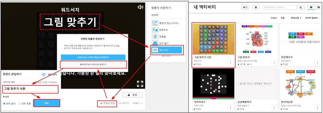 또 wordwall 의 가장 큰 특징 중에 하나는 활동에서 이미 만든 문제를 이용해서 다양한 형태의 활동으로 바로 변환할 수 있다는 점이다. 똑같은 문제를 가지고도, 클릭 한번으로 단어찾기 게임이나 기억력 게임등 제공되는 다양한 템플릿 형태의 게임으로 변환시켜 학생들에게 매번 새로운 과제를 제공할 수 있다. 그리고 이미 만든 활동 5개를 템플릿 변환하기를 통해 다른 템플릿으로 변환한 후 콘텐츠 편집을 눌러 수정하면 5개로 제한된 액티비티 숫자가 늘어나는 효과도 있다.