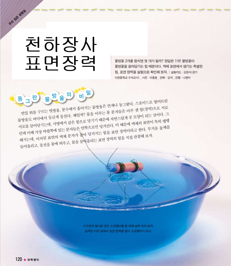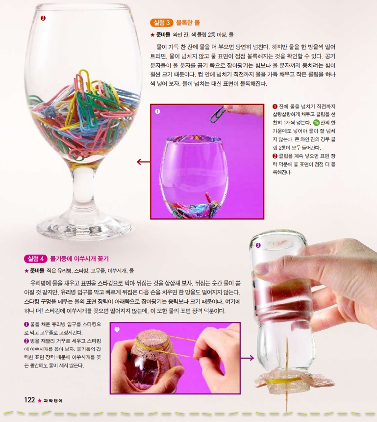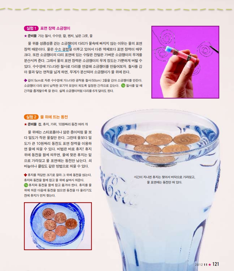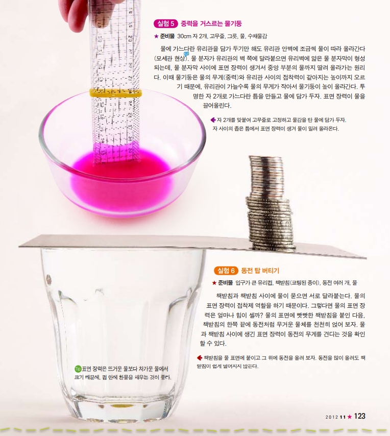 맨밑에 사진은 제가 좋아하는 표면장력 실험인데 물컵 위에 카드 올리고 카드위에 동전이나 무거운 물체 올리는 실험입니다. 원고 보내기 전에 샘플로 찍은 사진입니다.