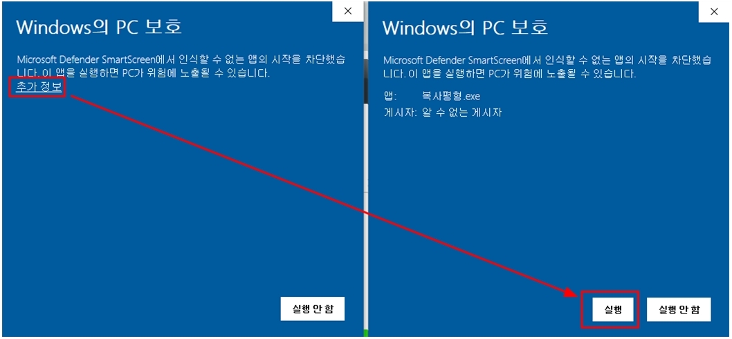 해결책은 추가정보를 눌러 – 실행을 시키면 된다.