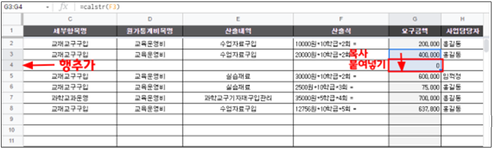 구글스프레드 시트에서 산출식을 계산하는 calstr 함수 사용해서 예산편성에 사용하기