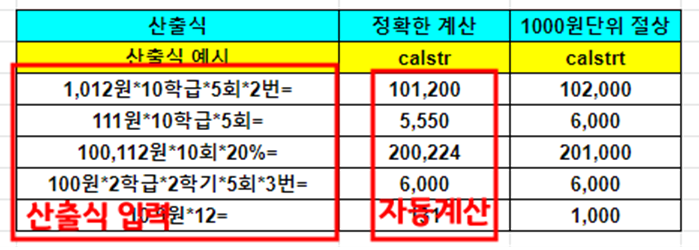 calstr 함수를 사용하면 아래 그림처럼 산출식을 한글로 적으면 알아서 자동으로 계산을 해서 계산값이 나오게 할 수 있다.