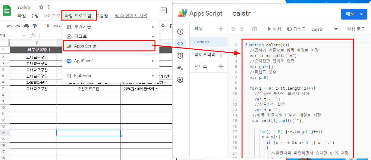 학교 예산을 산출하는데, 엑셀에서는 산출식에 입력한 내용을 자동으로 계산하는 calstr 함수가 있다. 그런데 구글스프레드 시트에는 calstr 함수를 지원하지 않는다.