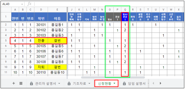 1) 전출생 처리 : 신청현황 시트에서 시험보기전 전출생이나 자퇴생은 이름을 결번으로 수정(삭제하면 안됨. 학번에 사유를 쓰고 이름만 결번으로 수정)