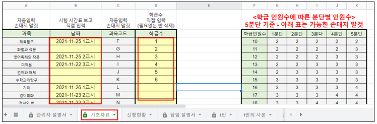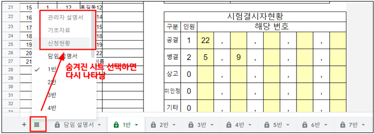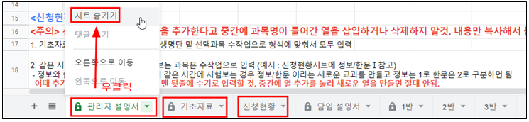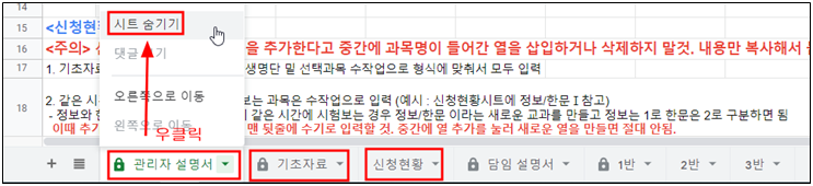 1. 관리자 설명서, 기초자료, 신청현황 3개의 시트와 필요없는 반은 담임 선생님이 볼 필요 없으므로, 시트 숨기기 하고 링크 공유.