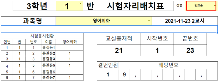 고등학교에서는 시험을 볼 때 학생들 선택과목이 많아, 시험시간 마다 선택과목순으로 새로 자리 배치를 하는 경우가 많다. 그런데 담임선생님이 매번 자리배치를 하는게 쉽지 않다.