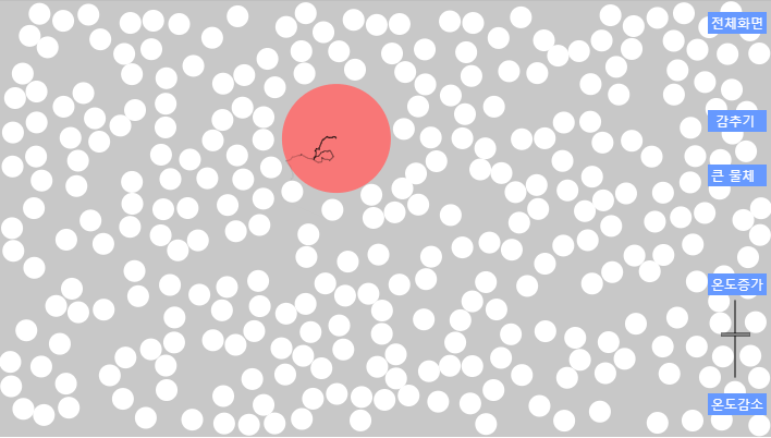 온도증가와 감소 버튼을 온도를 조절해 보면서 온도에 따른 브라운 운동의 변화를 관찰해 볼 수 있다.